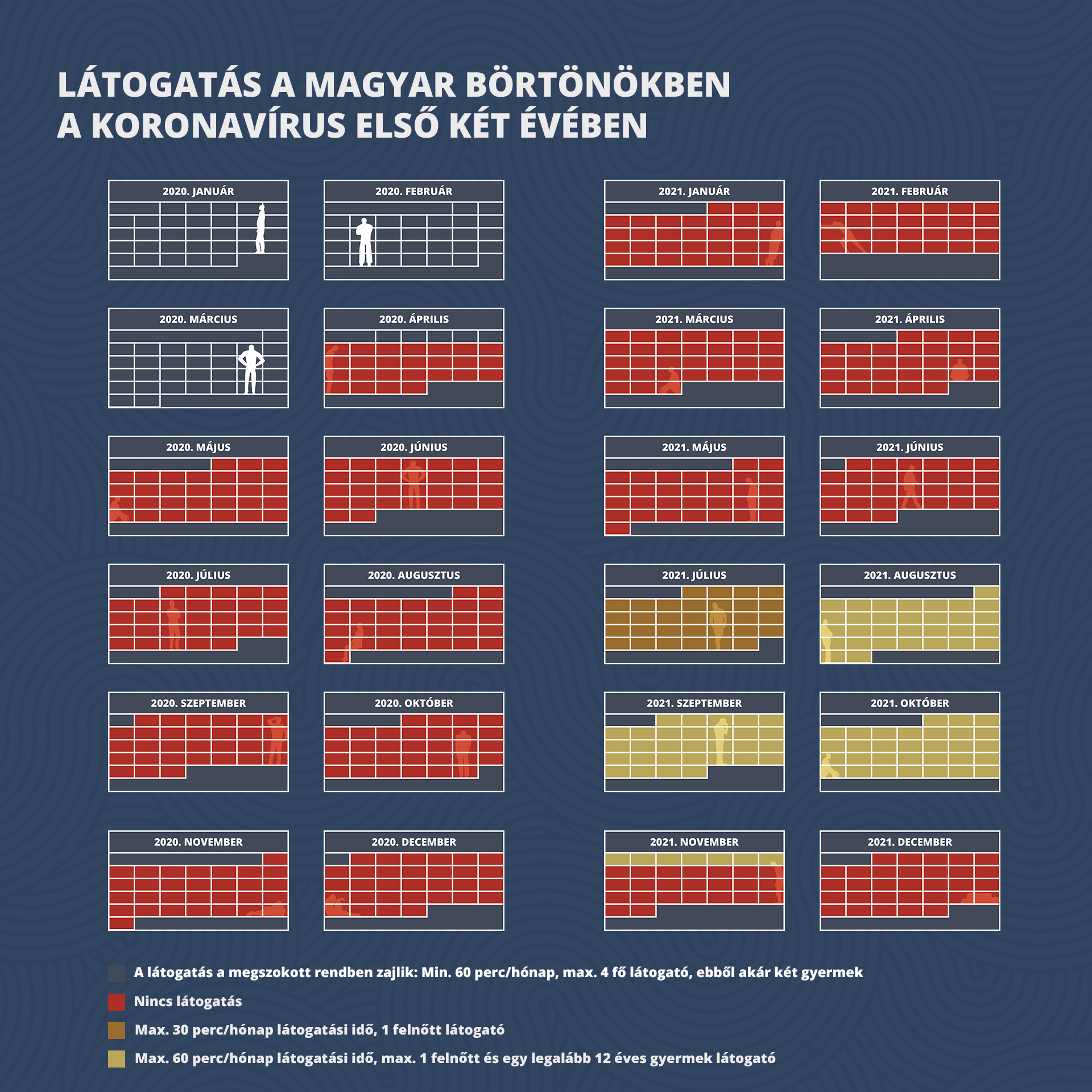 A hazai büntetés-végrehajtás történetében példátlannak számít az, hogy az elmúlt két évben mindössze négy olyan hónap volt, amikor a rabok látogatót fogadhattak. A maradék húsz hónapban senki senkit semmilyen feltételek mellett nem látogathatott meg a börtönben. Ha – mint hírlik – májusban meg is szüntetik ezt az igazolhatatlan tilalmat, az még nem oldja meg azokat az utóbbi években felszaporodott problémákat, amelyeket az esztelenül szigorú büntetőpolitika okoz. Most is negyvenezer gyerek van megfosztva a családi élethez fűződő jogaitól.