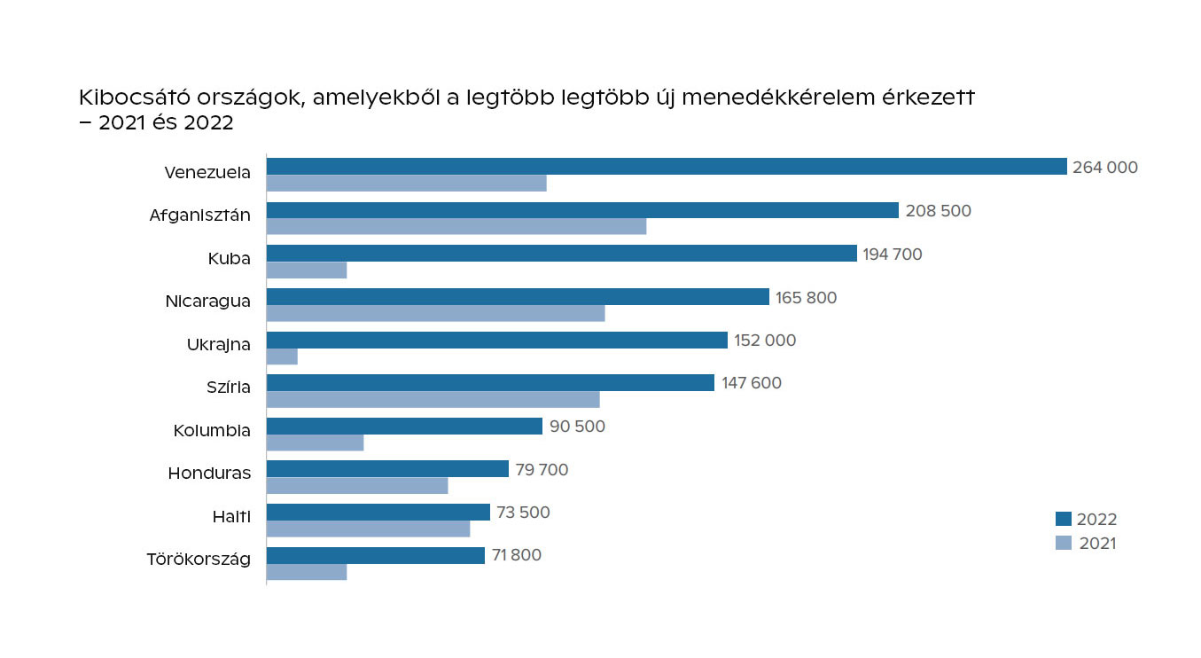 3. A 19,1 milliós éves növekedéshez képest tavaly csak 2,6 millió új menedékkérelmet adtak be világszerte. A viszonylag alacsony számnak az is az oka, hogy az ukrán menekülők a legtöbb európai országtól (így Magyarországtól is) automatikusan ideiglenes védelmet kaptak. A legtöbb menedékkérelmet az Egyesült Államokban nyújtották be, 730 ezret. Ezt Németország követi 218 ezerrel és Costa Rica 130 ezerrel.