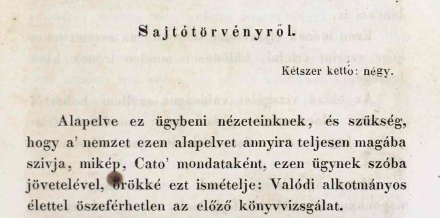a „valódi alkotmányos élettel öszeférhetetlen az előző könyvvizsgálat [a cenzúra]. […] Olly bizonyos, mint kétszer kettő; négy, minden alkudozás [...] összeférhet[et]len az alkotmányosság eszméjével.”